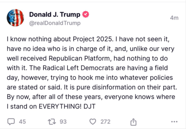 The TDS-sufferers on “the right” are following their emperor’s example and calling it a disinformation hoax, although the document definitely exists (and was not created by Radical Left Dems). It has a foreword by Kevin Roberts, the Heritage Foundation’s president and a Project 2025 leader. Roberts is also releasing what sounds like a more popularized version of it later this year, timed with the election: Dawn’s Early Light: Taking Back Washington to Save America.
