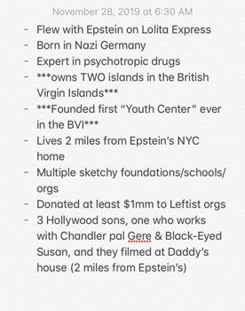 Returning to the Epstein connection: Virginia Roberts Giuffre, in court documents from a civil suit, released in 2019, claimed she was told to have sex with (famous computer scientist and 2001-advisor) Marvin Minsky, at Epstein’s compound in the US Virgin Islands, when she was 17 and Minsky was 73 (she also named Alan Dershowitz, Norman Finkelstein’s great nemesis). A second witness testified taking a private plane from Teterboro to Santa Fe and Palm Beach with Minsky, in March 2001, and that Epstein, Ghislaine Maxwell, and Dr. Henry Jarecki were passengers on the same plane (PPEmpire, Feb 2023).