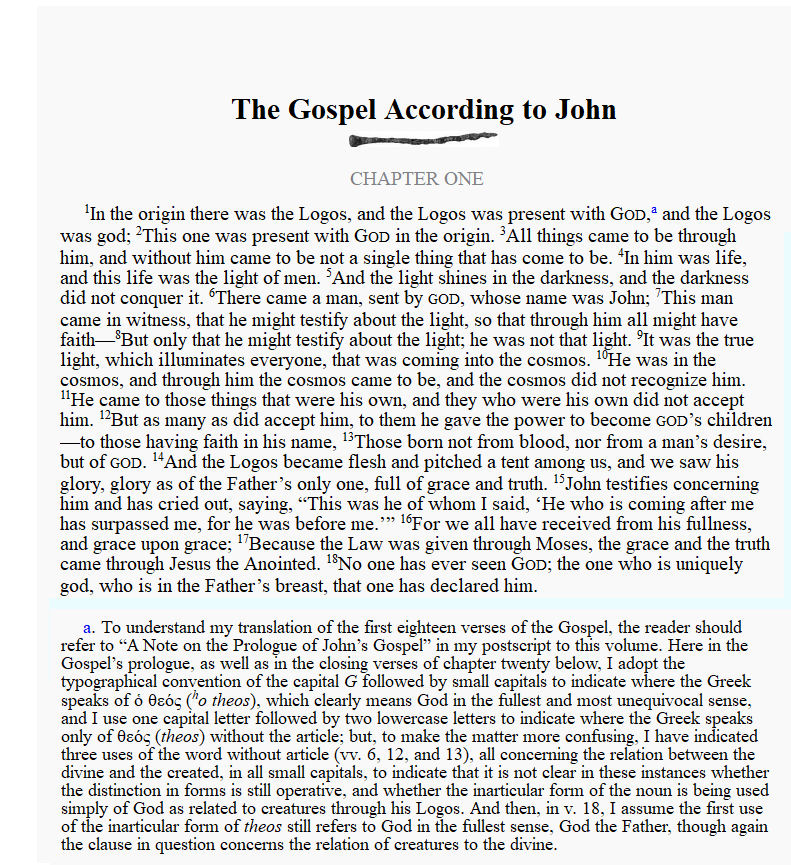 Despite the absence in John’s Gospel, this excerpt (specifically the line “the Logos became flesh”) was central to the assertion and establishment, at the councils of Nicea and of Chalcedon, of the dogma that Jesus was BORN divine, co-equal with GOD the Father, as compared to the Adoptionist view, that: