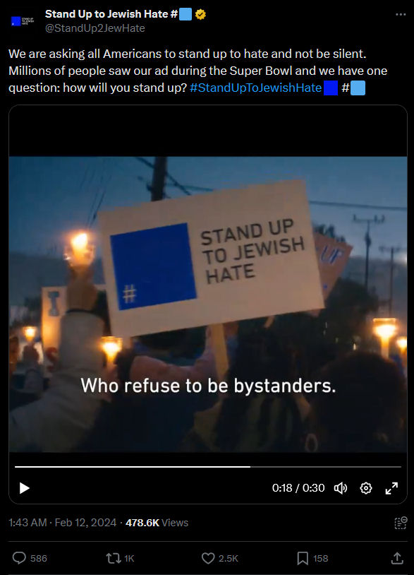 If there’s any doubt, the X account has the line, “Use the # to show solidarity for the #Jewish community and #StandUpToJewishHate.” Yet when the Superbowl ad shows protesters waving banners with the same slogan, how are we to know these banners aren’t held by Palestinians, using the phrase in a more grammatically correct manner?