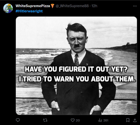 2) Presumably the hashtag Hitlerwasright# is meant as an example of “Jewish Hate,” and the rest of this Hashtag would be “about the Jews.” Isn’t this perilously close to the sentiment being stirred up currently, in millions of people and extending far beyond 4chan and 8chan, by you-know-who, doing you-know-what, in you-know-where.