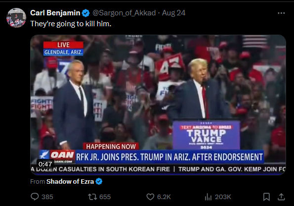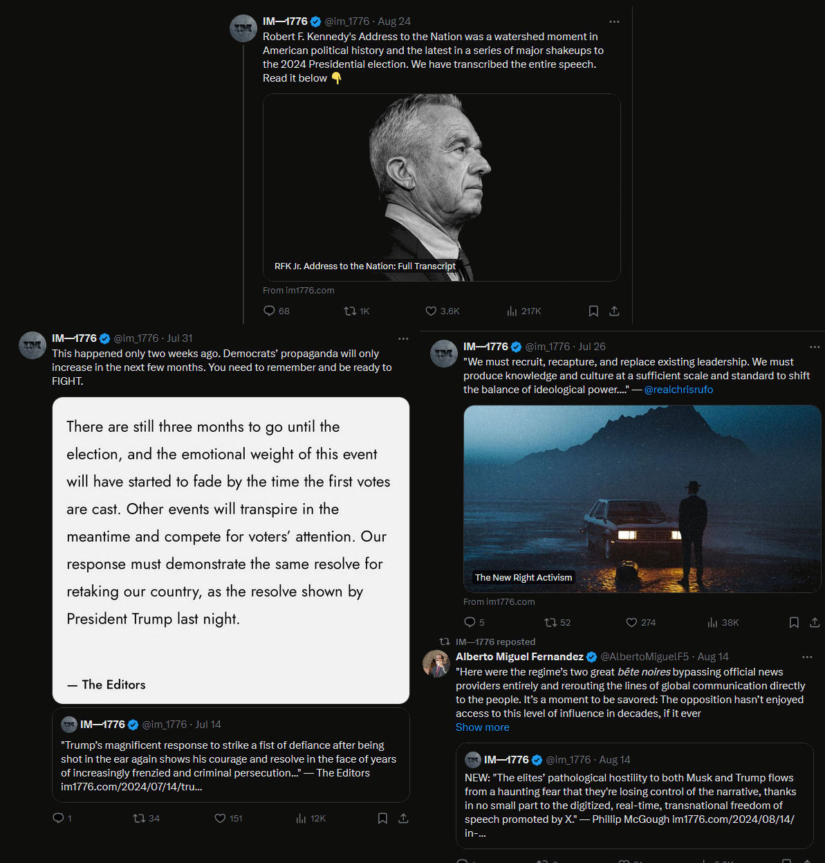 IM-1776’s X-feed gives a fairly good idea of the prevailing “alternate media” narrative leading up to the election. The magazine also seems to be firmly plugged into Peter Thiel’s “deep right” network, including an interview with Blake Masters, Curtis Yarvin’s debate with Christopher Rufo, and a 2023 interview with recent Trump-endorser RFK, Jr. (the Co$ files on whom I will release soon, if don’t die or lose internet access first).
