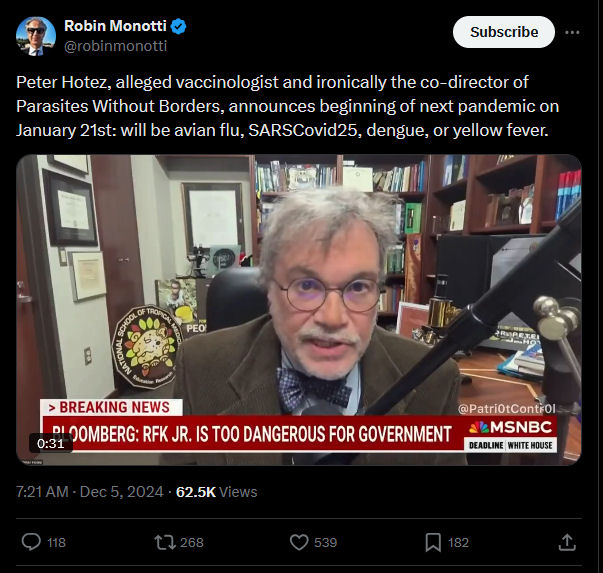 Over dinner last week, my wife mentioned that (vaccine advocate) Peter Hotez had announced a flurry of new pandemics (avian flu, SARSCovid25, dengue, yellow fever, polio!), complete with a release date (as tweeted by Robin Monotti):