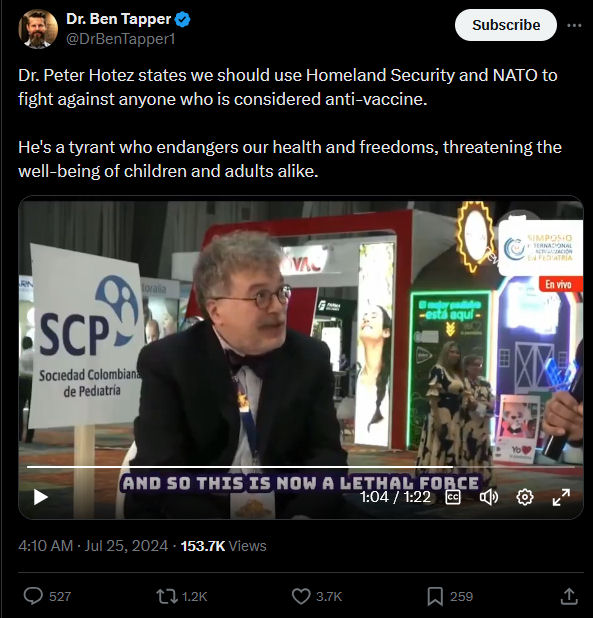 Hotez is the same guy who, earlier in the year, was advocating the use of Homeland Security and NATO to crush anti-vaccine dissidents (as tweeted by Ben Tapper). “200,000 Americans died because of anti-vaccine aggression. This is now a lethal force.”